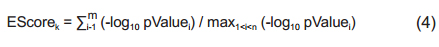Given a disease associated with a set of genetic pathways ℛ the gene-wise enrichment score (EScore) for the kth gene, within a gene set of size n, is defined in Eq. (4) as