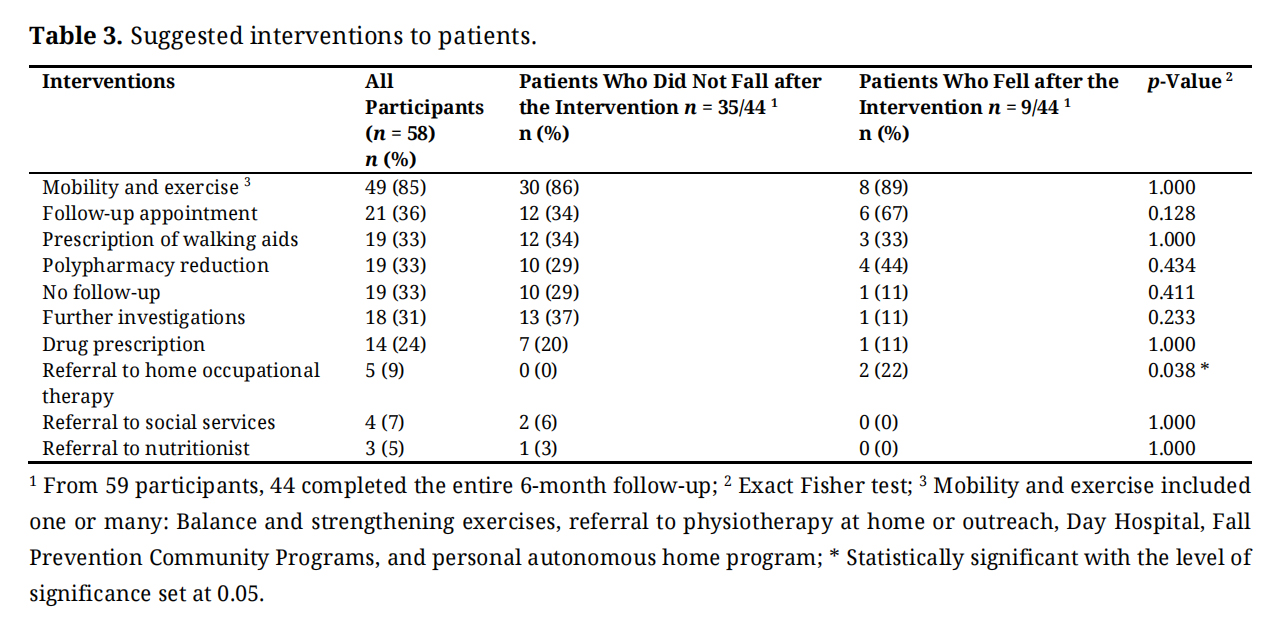 In our study, the primary intervention for patients who experienced more falls after the intervention was to schedule a medical follow-up. This indicates that the patients were accurately identified during the initial evaluation and were closely monitored to help promote their response to interventions. Finally, requests for a home visit by an occupational therapist were more frequent in patients with recurrent falls. This suggests that the team had identified a persistent functional problem and tried to ascertain the palliation of fixed deficits through a home visit with an occupational therapist.