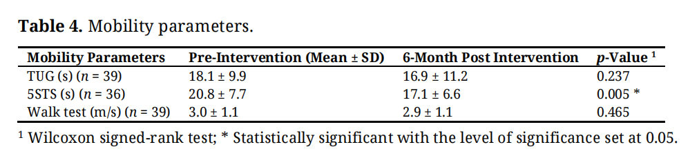A Wilcoxon signed rank test was used to analyze whether the intervention influenced mobility parameters between pre- and 6-month post intervention (STS, TUG, and walk test (gait speed)). Data were analyzed using IBM SPSS Statistics version 24.0 (IBM Corp., Armonk, NY, USA).