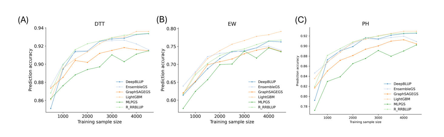 Figure 4. Prediction accuracies of three traits in the maize6000 dataset across varying training sample sizes. The full dataset contained 5831 samples, from which 4,664 lines (80%) were randomly selected as the training population and 1167 lines (20%) as the test set. A random subset of 10,000 SNPs was used as markers. From the 4,664 training lines, subsets of different sizes were randomly sampled and used to predict the fixed set of 1167 test samples. Panels show results for: (A) days to tassel (DTT); (B) ear weight (EW); and (C) plant height (PH).