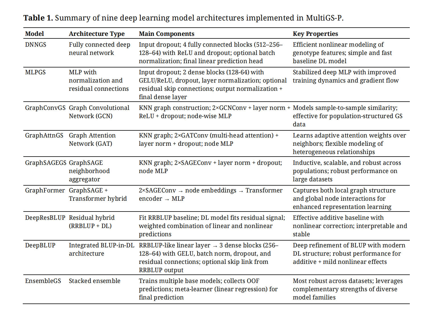 All DL models were systematically tuned during development to ensure stable training and competitive performance across datasets. The default hyperparameters for all models implemented in MultiGS-P are provided in the template configuration files and are summarized in Table S3.