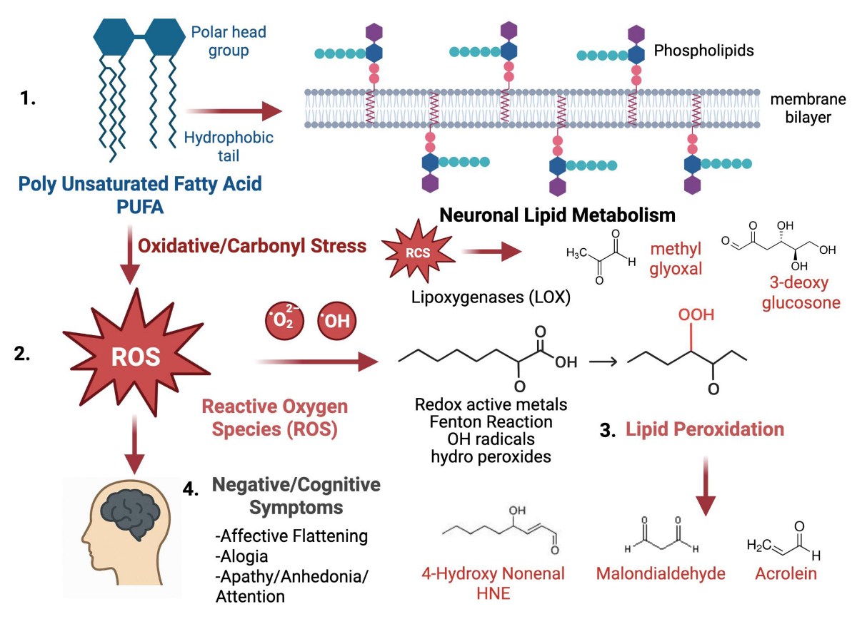 Figure 3. Oxidative stress causes lipid peroxidation and affects neuronal function. Polyunsaturated fatty acids (PUFAs) are vital parts of neuronal phospholipid membranes, helping maintain their structure and supporting signaling functions. During oxidative and carbonyl stress, reactive oxygen species (ROS) and reactive carbonyl species (RCS), such as superoxide, hydroxyl radicals, methyl glyoxal, and 3-deoxyglucosone, attack lipids containing PUFAs, initiating lipid peroxidation through enzymatic (lipoxygenases) and non-enzymatic (redox-active metals, Fenton Reaction) pathways. These reactions produce highly reactive aldehydes, including 4-hydroxy-2-nonenal (HNE), malondialdehyde (MDA), and acrolein, which weaken membrane stability and cause more oxidative damage. The buildup of lipid peroxidation products increasingly links to neuronal dysfunction and the development of negative symptoms in neuropsychiatric disorders [1]. [Created in BioRender. Roychaudhuri, R. https://BioRender.com/wcbzvp6 accessed on 10 Nov 2025].