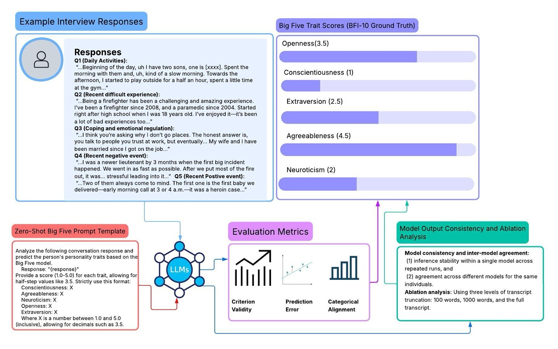 The emergence of LLMs, such as OpenAI’s GPT and Meta’s LLaMA, has introduced new opportunities for modeling psychologically relevant information from language. These models provide a wide range of capabilities, including functioning as conversation agents, generating essays and stories, writing code, and assisting in diagnostic reasoning [21–25]. As a result, researchers have begun exploring their potential for personality-related annotation and inference from text [26,27]. However, a critical question remains: to what extent can LLMs extract personality-related signals from real-world conversational language under realistic observational constraints?