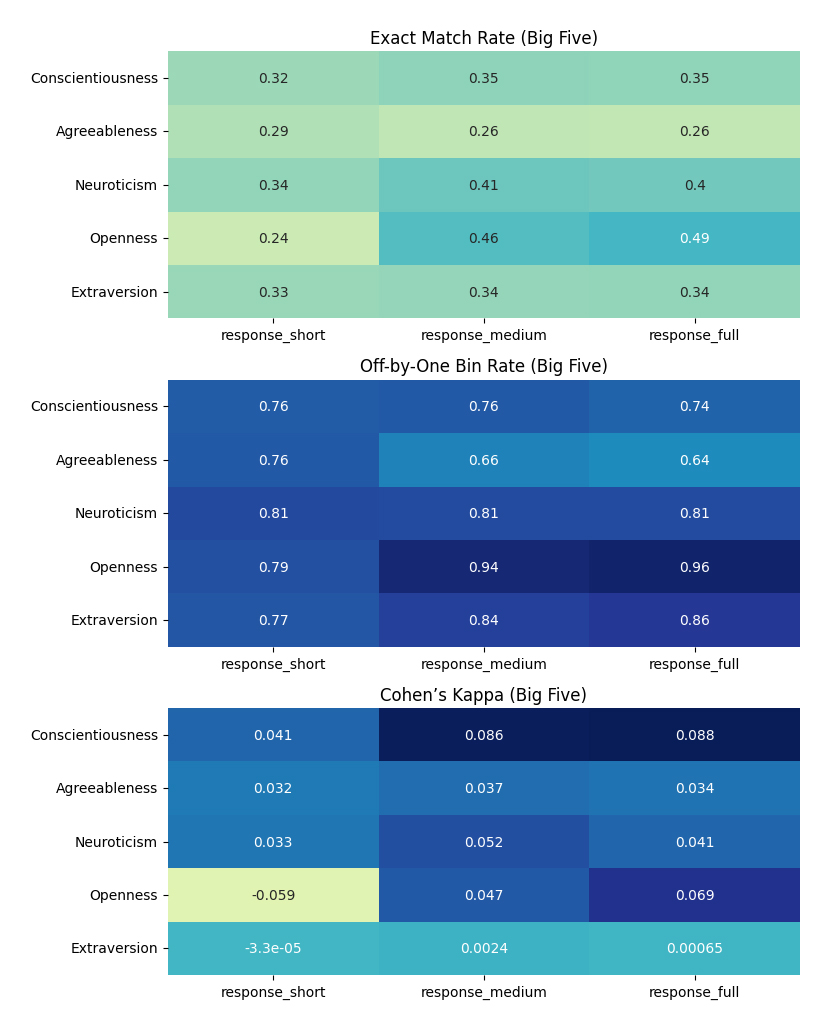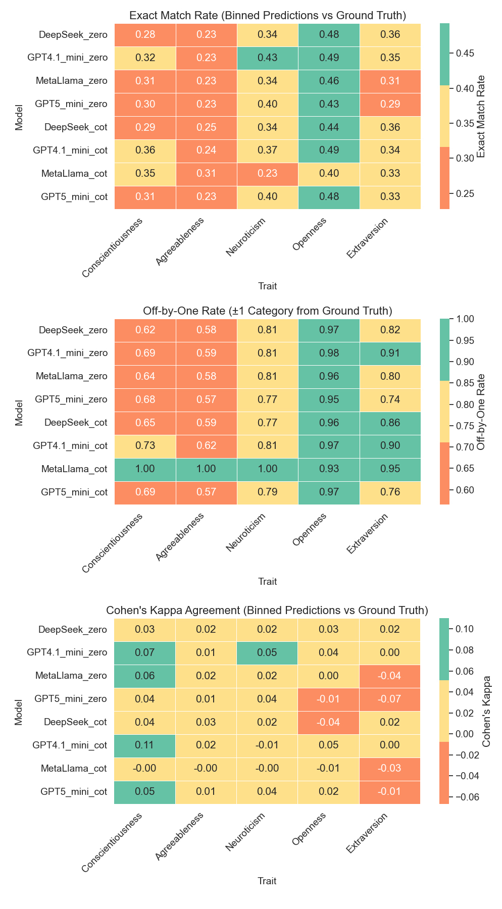 Figure 8 summarizes the exact match rates, off-by-one accuracy, and Cohen’s kappa scores for Big Five trait. Exact match rates ranged from 23% to 49%, with GPT-4.1-Mini (zero-shot) achieving the highest values for Openness (0.49), Neuroticism (0.43), and Extraversion (0.35). The lowest exact matches occurred under Meta-LLaMA (CoT) for Agreeableness and Neuroticism (0.23).