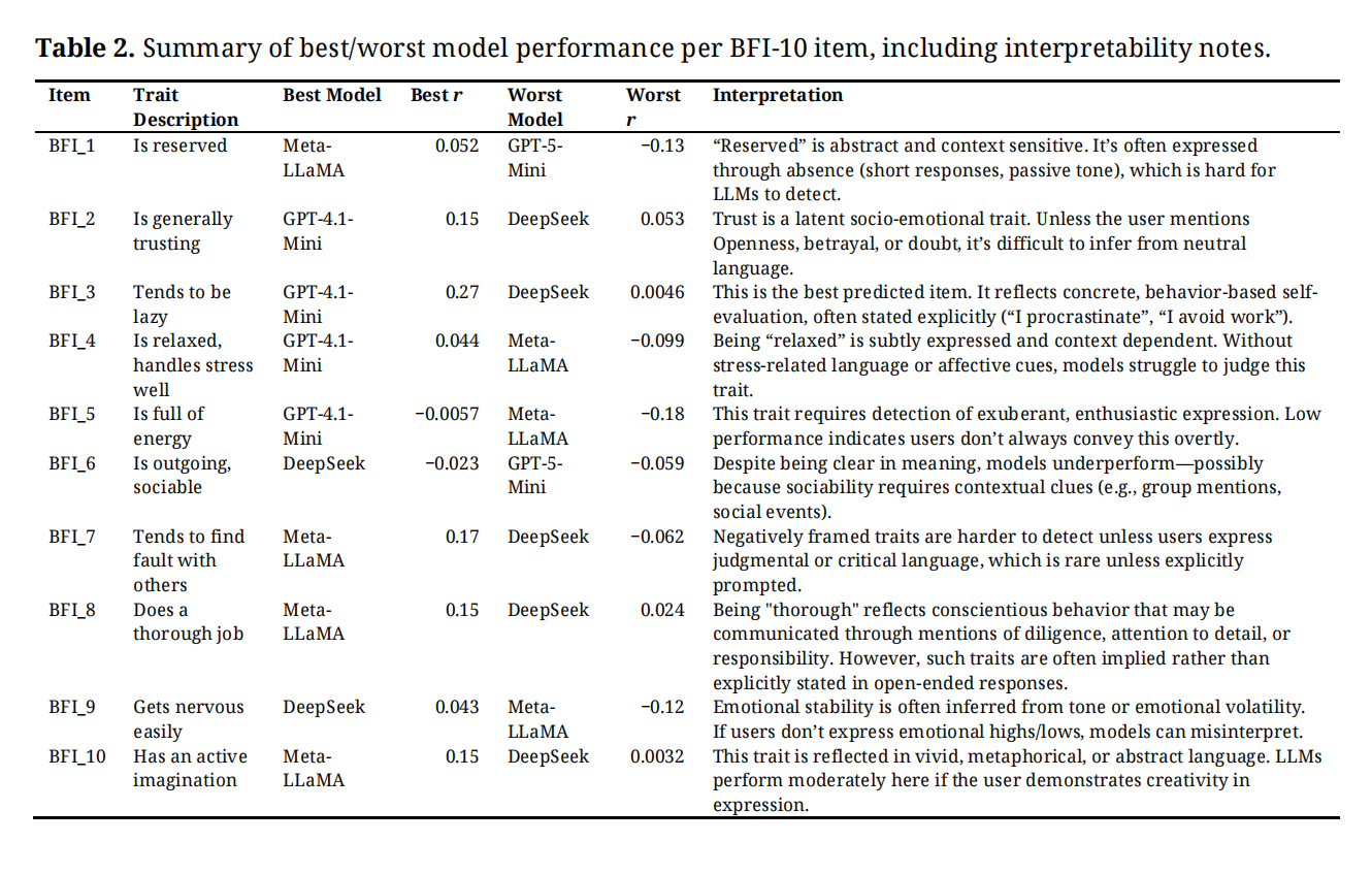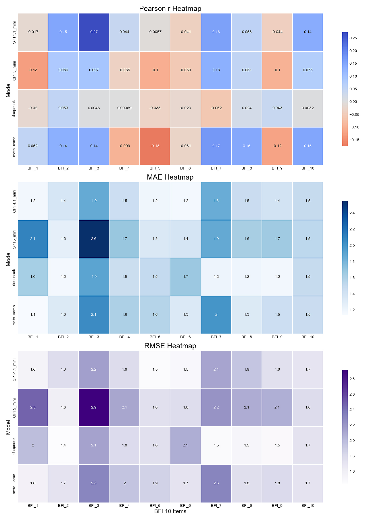 Error-based metrics revealed substantial deviations between predicted and true item scores. Meta_LLaMA produced the highest MAE and RMSE values, with mean errors approaching 2.0 across items. Its poorest performance occurred on BFI_3 (MAE = 2.6; RMSE = 2.9) and BFI-1 (MAE = 2.1; RMSE = 2.5), followed closely by GPT5-Mini. DeepSeek, despite showing the near-zero or negative correlations, achieved the lowest MAE and RMSE score on several items (BFI-2 and BFI-7 to BFI-9), with values around MAE ≈ 1.2 and RMSE ≈ 1.5. Table 2 summarizes these best and worst performing cases and notes interpretability considerations.