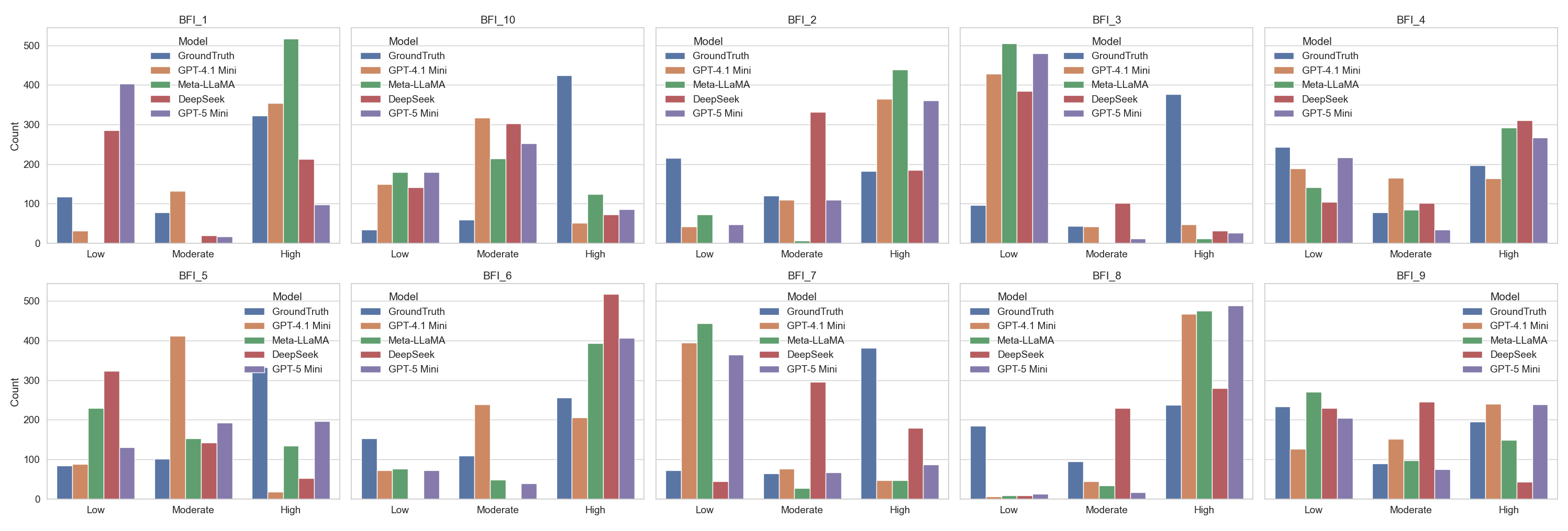 Figure 3 visualizes predicted response distributions on the 1–5 scale relative to empirical human response frequencies. Discrepancies were most pronounced for BFI-3, BFI-5, BFI-7, and BFI-10, where prediction errors exceeded 200 responses in some bins. For instance, on BFI-10 (“has an active imagination”), the self-report reference frequency for high scores (4–5) was approximately 400, where GPT-4.1-Mini and DeepSeek predicted fewer than 100. More consistent alignment was observed for BFI-4 (“is relaxed, handles stress well”) and BFI-9 (“gets nervous easily”), with GPT5-Mini showing the closest match. Across multiple items, including BFI-1, BFI-2, BFI-3, BFI-7, and BFI-8, models performed poorly in the low-score bins, frequently underestimating counts by approximately 200.