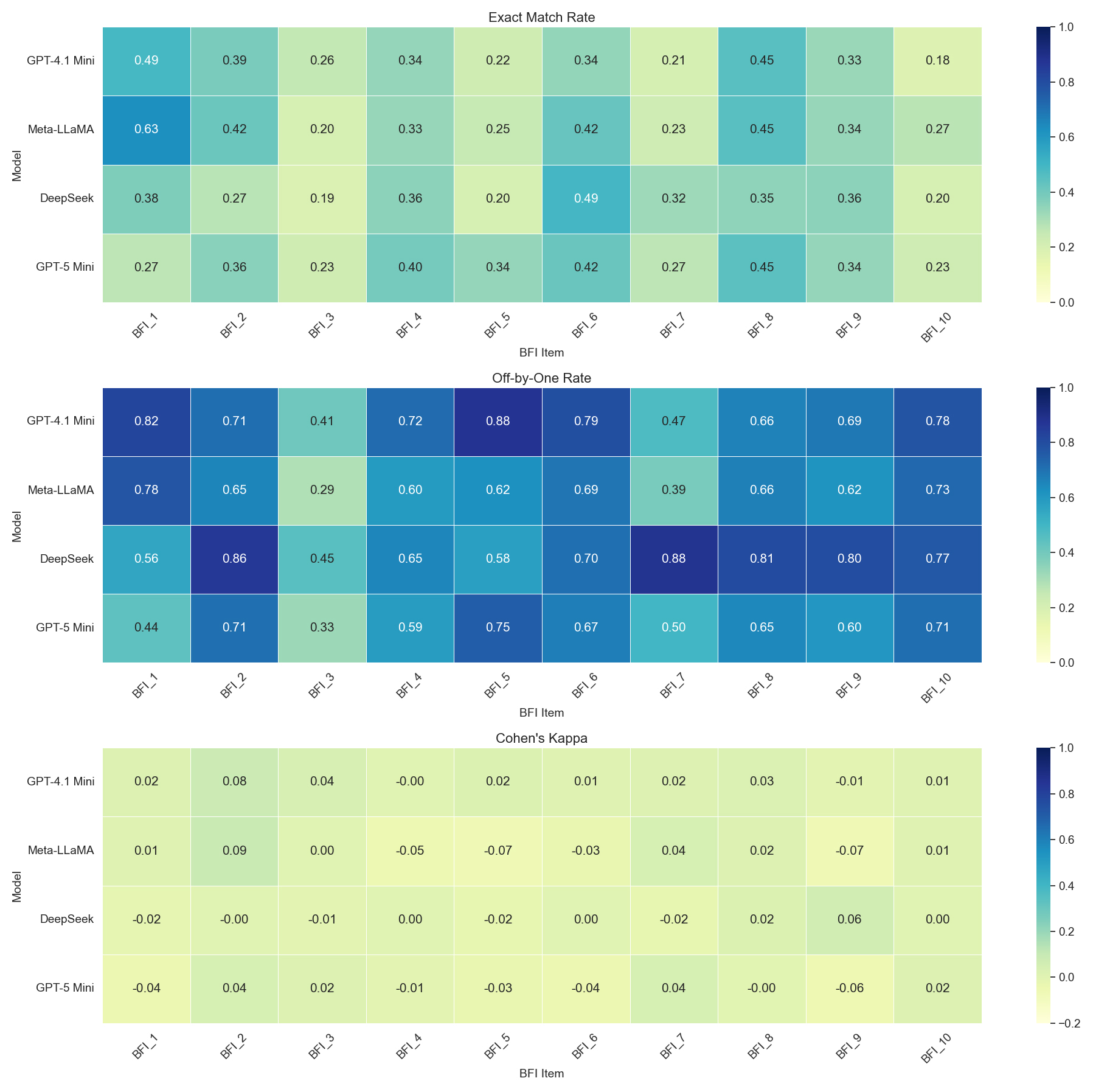 Figure 4 reports the exact match rates, off-by-one accuracy, and Cohen’s kappa values. Exact match rates ranged from 18% to 63%, with Meta-LLaMA achieving the highest exact match on BFI-1 (“is reserved”, 62%), and GPT-4.1-Mini the lowest match rate on BFI-10 (“has an active imagination”, 18%). Off-by-one accuracy was substantially higher, with most values exceeding 70%; GPT-4.1-Mini reached 88% for BFI_5, and DeepSeek achieved 88% for BFI_7. The lowest off-by-one accuracy was observed for Meta_LLaMA on BFI_3 (29%), followed by DeepSeek on BFI_7 (39%). Despite these moderate accuracy levels, Cohen’s kappa scores remained uniformly low, often near zero or negative (e.g., BFI-5 and BFI-6), indicating that much of the agreement was driven by chance rather than genuine predictive alignment. For completeness, we report both Pearson r and Spearman ρ correlations, along with 95% confidence intervals, in Supplementary Material Table S3.
