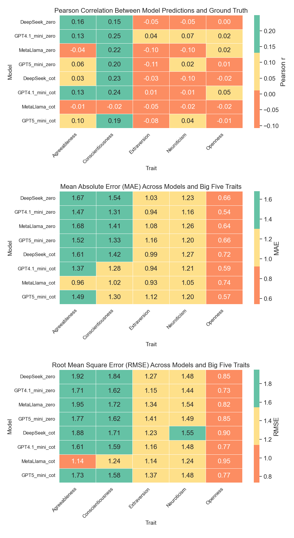 Error-based metrics (MAE, RMSE) were generally above 1.0 for all traits except Openness. Agreeableness consistently exhibited the highest error rates across all models and prompting types, while Openness showed the lowest. Meta-LLaMA produced the largest overall errors for Agreeableness (MAE = 1.68; RMSE = 1.95); while GPT-4.1-Mini achieved the smallest errors on Openness (MAE = 0.54; RMSE = 0.73).