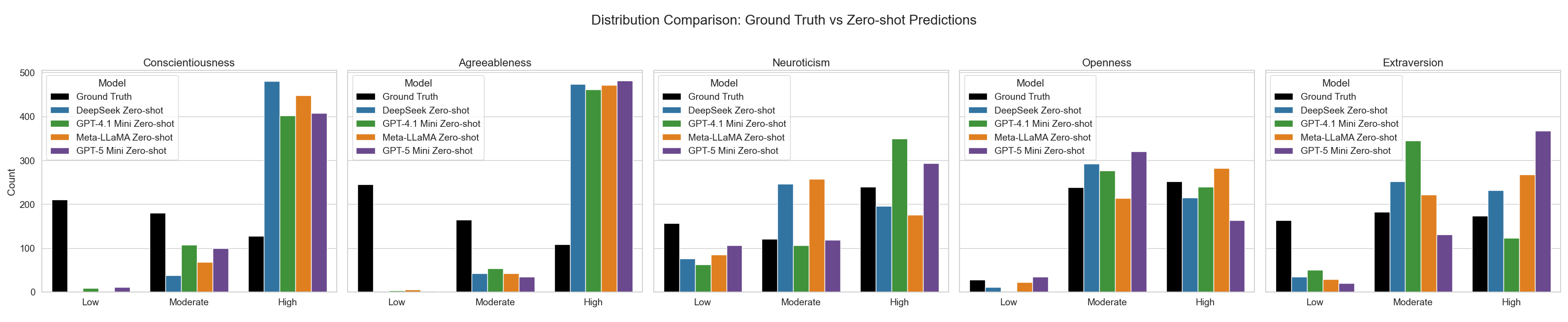 Distributional Alignment and Systematic Biases (RQ3)Predicted trait distributions systematically deviated from actual human distributions, with overestimation of moderate and high scores and underestimation of low scores. This bias resembles the “default persona” phenomenon documented by DeepMind (2025) [43], whereby instruction-tuned models generate stylized profiles that converge toward prosocial, articulate, or emotionally expressive norms. Such systematic biases, likely arising from instruction-tuning and normative language priors rather than dataset imbalance, reduce categorical accuracy even when off-by-one error appears acceptable, underscoring poor calibration and the absence of grounding in true population variability.