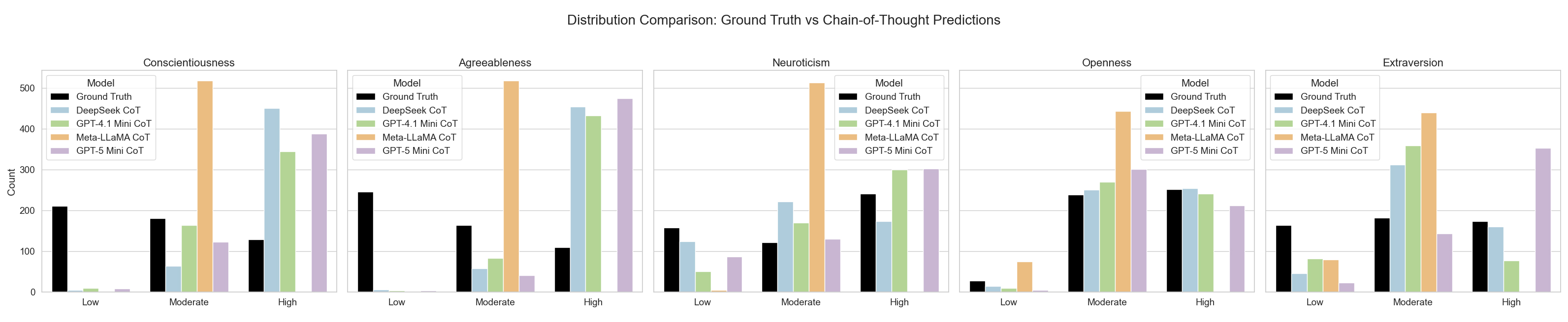 Figures 6 and 7 compare binned trait distributions (Low, Moderate, High). All models tended to overpredict Moderate and High scores while underestimating Low scores, particularly for Agreeableness and Conscientiousness, with overpredictions in the High bin exceeding self-report reference by nearly 300 counts. Openness and Neuroticism showed relatively better alignment. CoT prompting produced minimal distributional patterns for GPT-4.1-Mini, GPT-5-Mini, and DeepSeek, while Meta-LLaMA shifted toward more concentrated Moderate-level predictions rather than improving overall alignment.