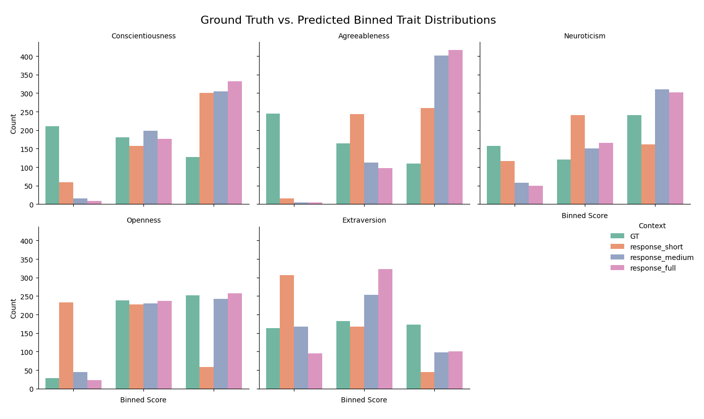 Figure 9 illustrates binned traits distribution across input lengths. Predictions in the moderate bin aligned most closely with self-report reference. For Conscientiousness and Agreeableness, high scores were consistently overestimated and low scores underestimated. Under short-context input, Openness deviated sharply, with over 200 predictions in the high bin compared to 50 in the self-report reference. Similar trends were observed for Extraversion. Medium and full-context conditions showed better alignment with self-report reference.