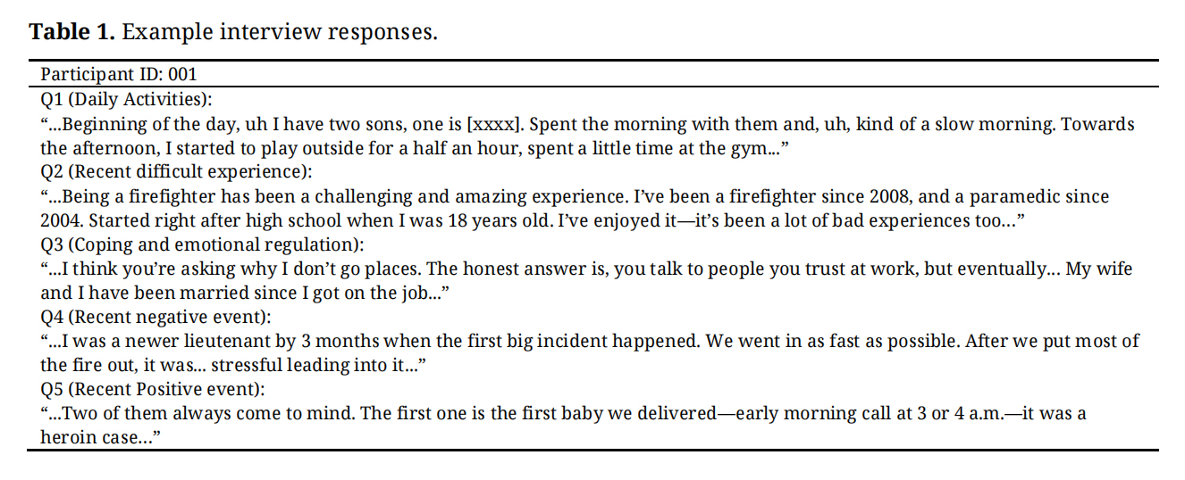 We utilized a novel dataset comprising 555 U.S. adults recruited across multiple behavioral research studies focused on adjustment to adverse or transitional life events (e.g., occupational stress, health conditions). All participants provided written informed consent and participated in interviews that were audio recorded for later transcription. Interviewers followed a script that included standardized prompts already demonstrated to elicit responses that broadly can predict psychological processes and functioning [31,32]. The full set of interview questions and example response excerpts are provided in Supplementary Materials Tables S1 and S2.