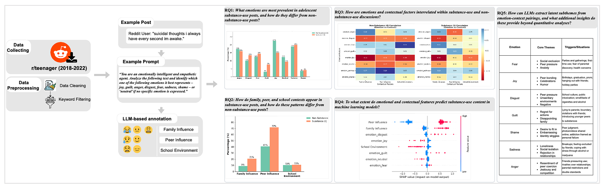 At a high level, the analytic pipeline for this study is illustrated in Figure 1. The study is guided by five research questions (RQ1–RQ5), which span emotion prevalence, contextual influences, and LLM-assisted thematic analysis. By integrating Reddit data, LLM-based annotation, and machine learning methods, this work aims to clarify the interplay between emotion and context in adolescent substance use.