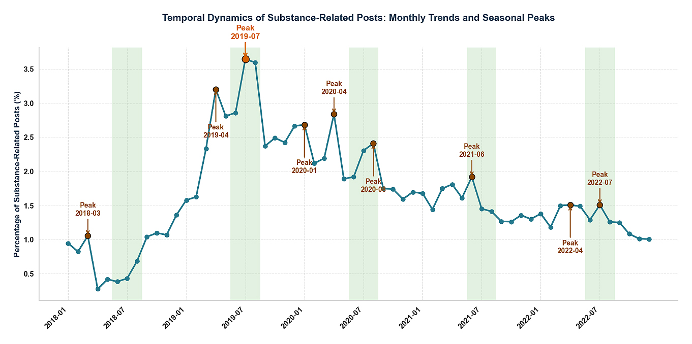 Figure 2 shows the distribution of substance use-related posts in the r/teenagers subreddit from 2018 to 2022. Monthly peaks were detected using the find_peaks function from SciPy library (scipy.signal), implemented in Python (version 3.10.18) [48]. Peaks were operationally defined as local maxima that exceeded both preceding and following months and exhibited a minimum prominence of 0.2 percentage points, thereby filtering out minor month-to-month variability.