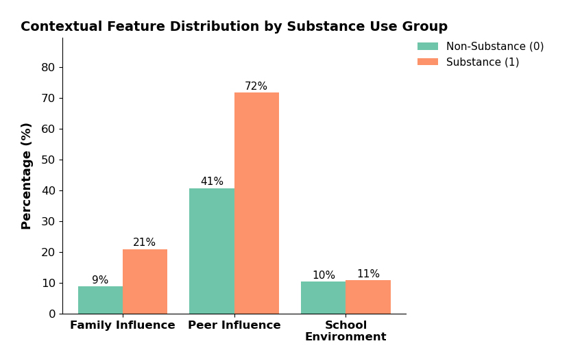 Figure 4 displays the distribution of contextual influences across substance use-related and non-substance-use posts. Peer influence was the most frequently mentioned context in both groups, with a markedly higher proportion in substance use-related posts (72%) than in non-substance-use posts (41%). Family influence was also more common in substance-use posts (21% vs. 9%). In contrast, school-related contexts were discussed at similarly low frequencies in both groups (approximately 10%).