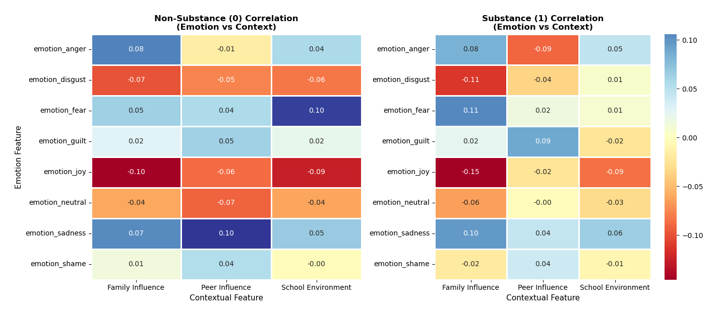 As shown in Figure 5, emotion-context correlations differed across groups. In substance use-related posts, family influence was most strongly associated with fear and sadness, with stronger associations than those observed in non-substance-use posts. Peer influence showed the strongest positive association with guilt, whereas school environment was most strongly linked to sadness. By contrast, in non-substance use posts, the school environment exhibited the strongest correlation with fear. Across both groups, family influence showed a consistent positive association with anger.