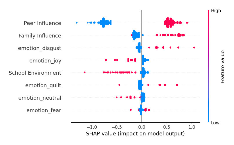 Figure 6 shows the SHAP values for contextual and emotional features. The XGBoost model achieved an accuracy of 0.67 on the test set, with a recall (sensitivity) of 0.75, precision of 0.68, and an F1 score of 0.71. Higher SHAP values for joy and school environment were associated with non-substance-use posts, whereas lower values indicated stronger associations with substance use. In contrast, peer influence, family influence, disgust and guilt showed higher importance for predicting substance use-related posts, underscoring their role as key emotional and contextual drivers in these discussions.