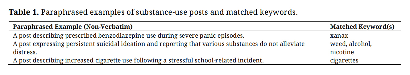 Following keyword-based filtering, we identified 23,275 substance-use posts and sampled an equal number of non-substance-use posts from the same time to construct a balanced dataset for subsequent analyses. The complete keyword list used for filtering is provided in Supplementary Table S1. Representative categories of ambiguous or non-substance keyword matches identified during manual review are summarized in Supplementary Table S2.