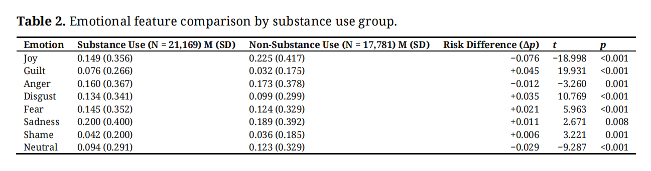 Statistical Comparisons and AssociationsGroup comparisons revealed significant differences in both emotional and contextual features between substance use-related and non-substance-use posts. As shown in Table 2, substance use-related posts exhibited higher levels of guilt, disgust, fear, sadness, and shame, whereas joy was more prevalent in non-substance use posts. Anger was slightly more common in non-substance use posts, although the effect size was small. Most emotional features showed highly significant group differences (p < 0.001), with anger (p = 0.001) and sadness (p = 0.008) also reaching significance at the p < 0.01 level. The largest proportional differences were observed for joy (Δp = −0.076), guilt (Δp = +0.045), and disgust (Δp = +0.035), whereas differences for anger, sadness, and shame were smaller in magnitude.