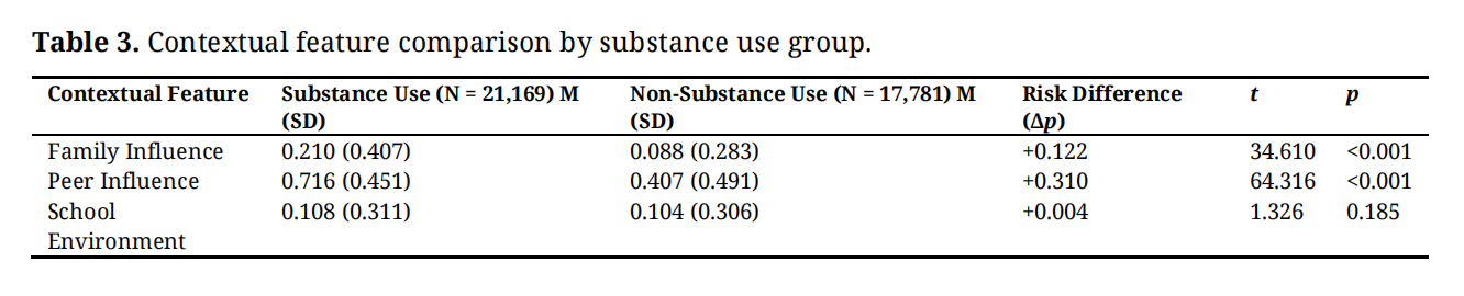 As shown in Table 3, substance use posts referenced peer and family influence significantly more often than non-substance use posts, with peer influence showing the largest difference between groups (p < 0.001). Peer influence exhibited the greatest proportional difference between groups (Δp = +0.310), followed by family influence (Δp = +0.122). In contrast, references to the school environment did not differ significantly between substance-use and non-substance-use posts (p = 0.185), with a negligible proportional difference (Δp = +0.004).
