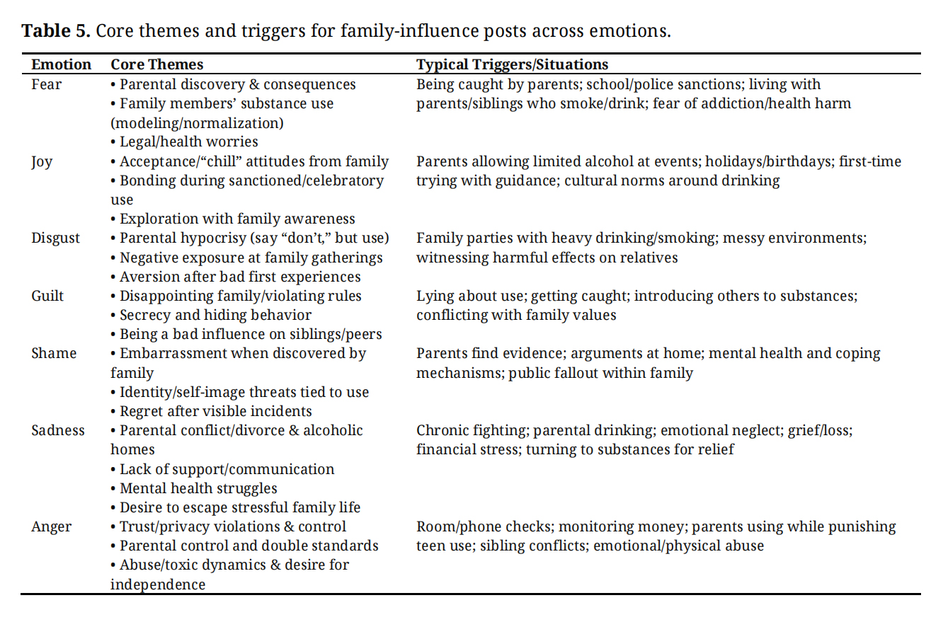 Family-related posts were characterized primarily by fear, guilt, and sadness, reflecting the central role of parents and siblings in shaping adolescents’ attitudes toward substance use. Posts described fear of discovery, guilt associated with disappointing parents, and sadness linked to family conflict, divorce, or parental alcohol use. Joy was reported less frequently and typically emerged in contexts where families adopted permissive or celebratory attitudes toward drinking. Overall, family contexts represented a dual landscape, functioning both a source of protection through expectations and monitoring and as a pathway to risk through modeling, conflict, or neglect.