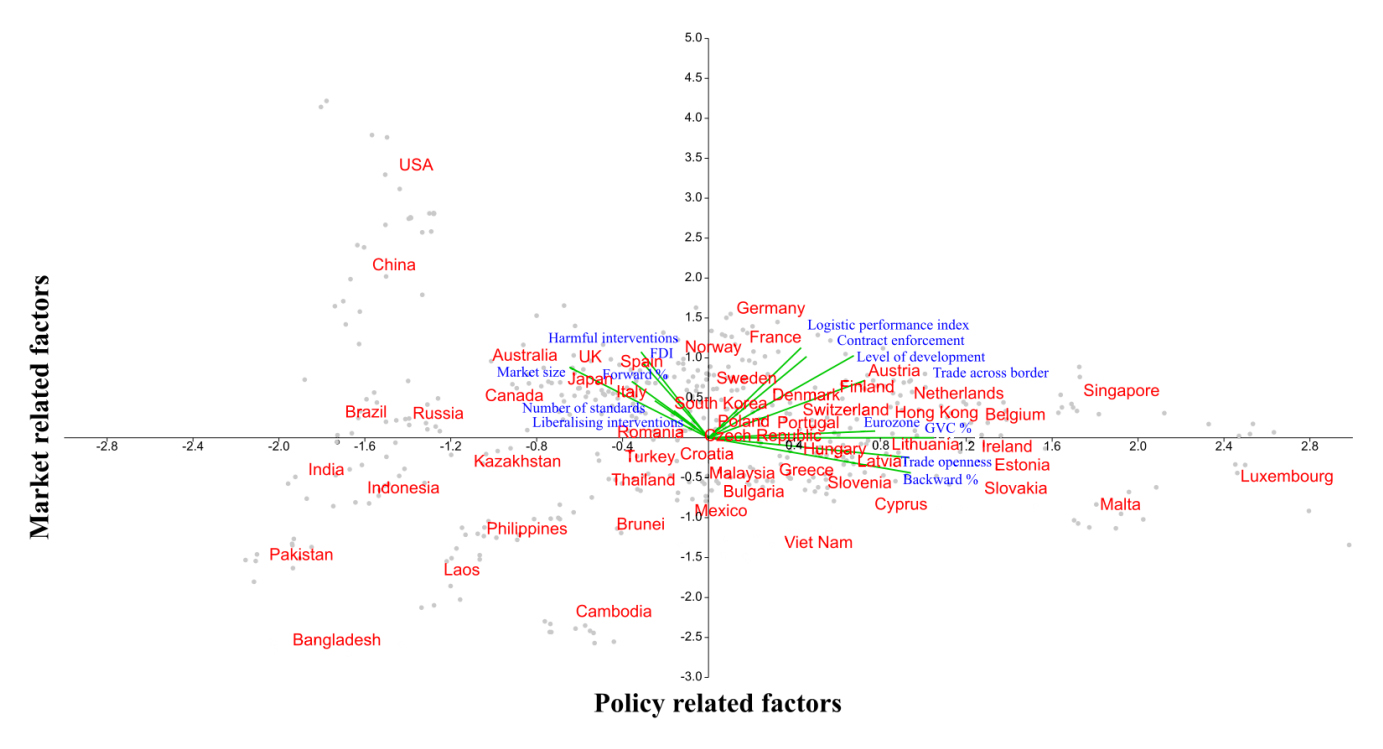 In the first step, principal component analysis (PCA) was undertaken for GVC, backward and forward participation, and all the influential (policy and market-related) factors. The purpose of the analysis was to graphically represent the data matrix in a two-dimensional space and determine the interrelationships between the factors by creating two latent components.