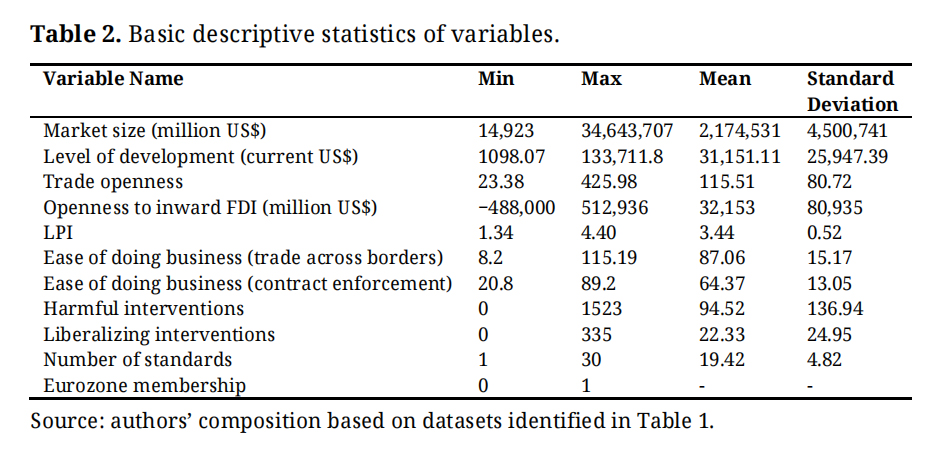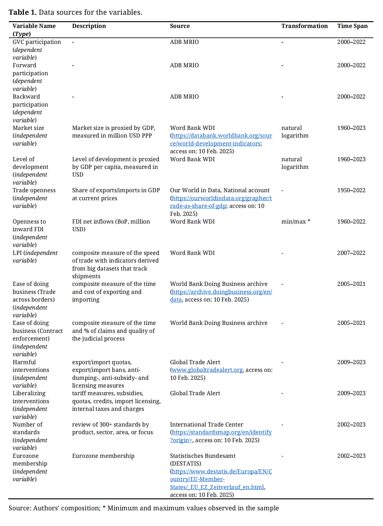 All GVC time series data were collected from the Asian Development Bank’s Multiregional Input-Output (ADB MRIO /2023/) tables. Data for the independent variables were collected from various sources, as is evident from Table 1. Development indicators were downloaded from World Bank databases. Market size, Level of development, and Openness to inward FDI values had to be transferred due to their relatively greater values compared to the other variables. For Market size and Level of development, we applied natural logarithm transformation. For Openness to inward FDI, min/max normalization was performed due to the possibility of negative values. During this process, the minimum was subtracted from the given value, and then the result was divided by the range (the difference between the maximum and minimum values). The purpose of these transformations was to prevent variables with larger values from dominating the analysis. In some cases, data for the last year was missing. Data for 2023 was estimated by calculating the average annual difference, taking the 2020/2021 and 2021/22 periods into consideration, and then adding the change to the 2022 value to calculate the 2023 value. Based on previous studies, the following trade policy-related variables were used in the analysis: the number of standards, harmful and liberalizing interventions, and Foreign Direct Investment. Market (non-policy) related variables are Eurozone membership, market size, level of development, the Logistic Performance Index (LPI), trade openness, trade across borders, and contract enforcement.