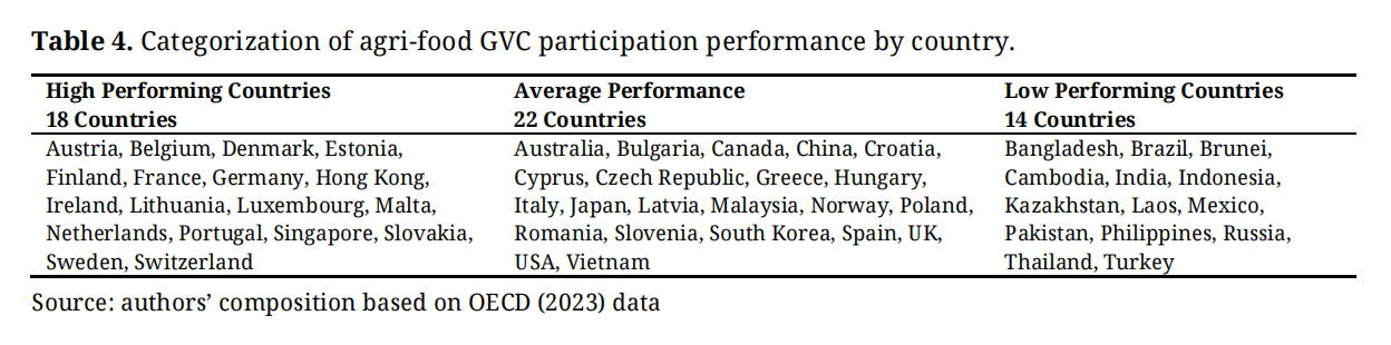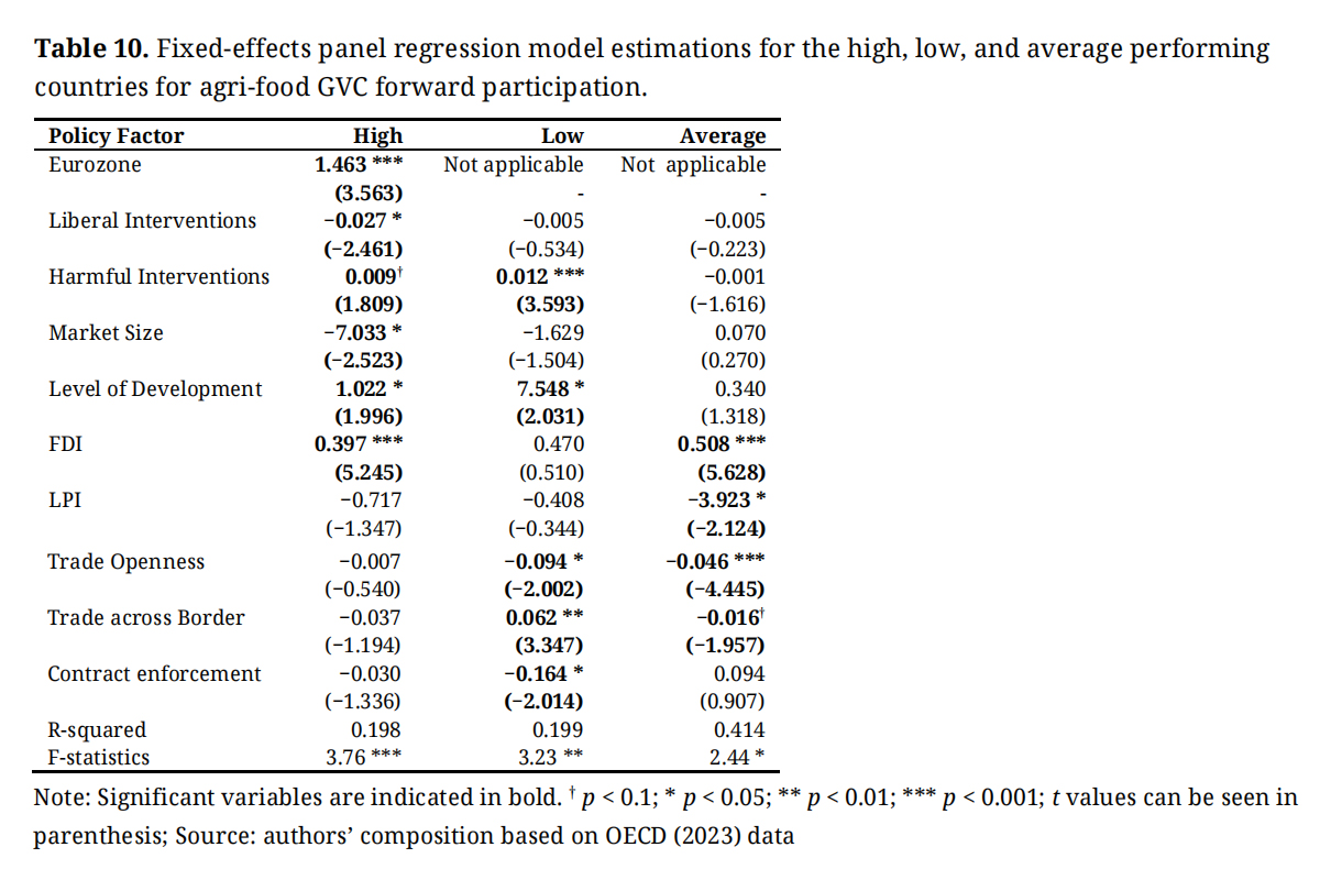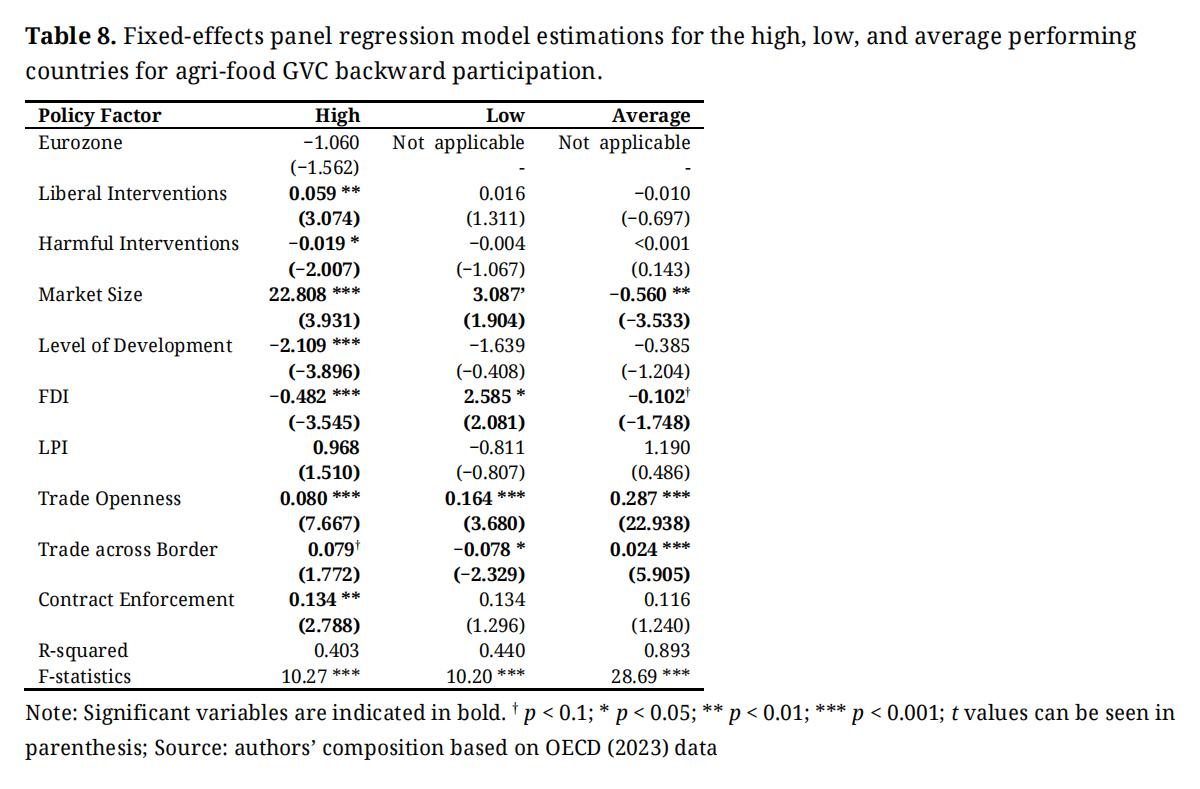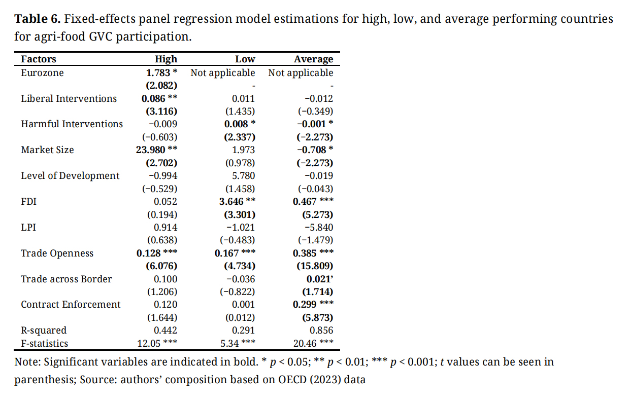 As is evident from Table 4, high-performing countries are mainly developed Eurozone countries with open markets and liberal trading policies, while low-performing countries are mainly developing countries with protectionist trade policies. Level of development, trade openness, trade across borders, and LPI are key for success, as well as contract enforcement, while market size, standards, FDI, and market interventions play only a limited role. In other words, market-related factors are more important than trade policy-related factors in pursuing GVC participation, at least in agri-food markets.