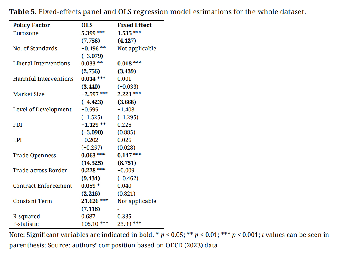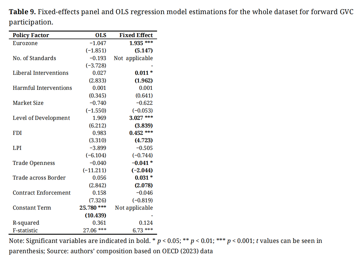The result of the OLS regression differs from the fixed-effects panel (Table 5). Eurozone membership and liberal trade interventions had a significantly positive effect on GVC participation in both models. Interestingly, the effect of market size differs depending on the model specification, though the level of development seems to have no influence on GVC participation, at least in the agri-food sector. Trade openness had some positive effects in both cases, but trade across the border and contract enforcement were only significant in the OLS model. Results also showed that FDI is negatively correlated with GVC participation in the case of the OLS regression.