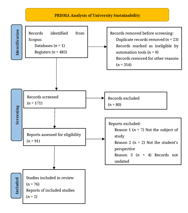 It yielded 485 records. Subsequently, data were processed using the VOS Viewer software version 1.6.20 (Centre for Science and Technology Studies, Leiden University, Leiden, The Netherlands) to find connections and co-occurrence indicators. Titles, abstracts, keywords, and methodological approaches focusing on the definition and evaluation of university sustainability were then defined as units of analysis. They were filtered using the PRISMA reporting guidelines [21] for document selection. Subsequently, content analysis was conducted (see Figure 1).