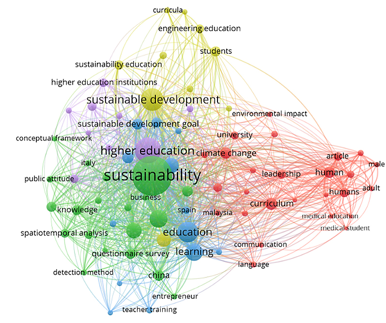 Cluster 2 (red colour) identifies the dimensions of university sustainability concerning the university’s substantive functions: education, research, and community outreach. The first dimension, education, is conceptualised as classroom activities and the teacher–student relationship. It includes integrating sustainability into the curriculum, adopting pedagogies that promote sustainable thinking, and developing teachers’ competencies in sustainability [37,42]. It is noted that the entire curriculum should, in some form, promote alignment with the principles of the 2030 Agenda [38].