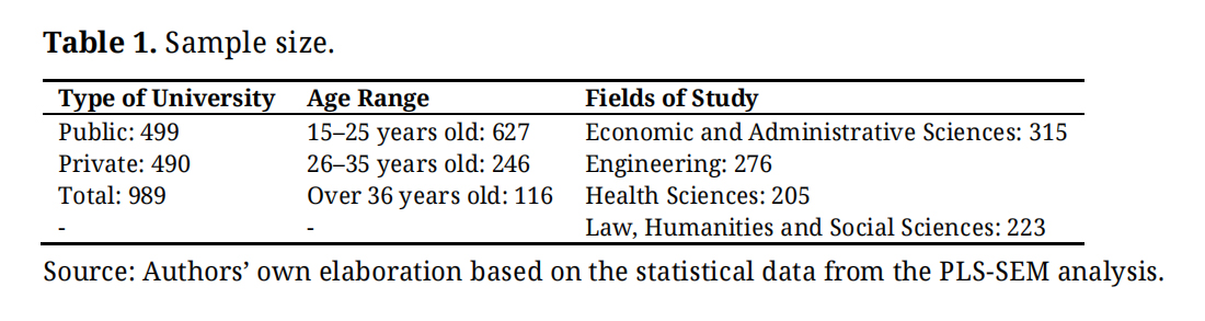 A total of 989 undergraduate students from 12 High-Quality Accredited universities in Colombia were surveyed. The sample size was non-probabilistic and based on convenience. The questionnaire was distributed through virtual platforms and classroom visits. From the 1012 responses obtained, and after analysing the presence of outliers, 989 valid responses were kept. The characterisation of the sample is presented in Table 1.