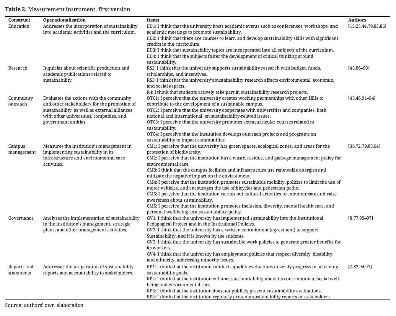 Following the literature review, the construct was characterised and its domain established. Based on this, the first set of questions was developed for each of the six dimensions identified in the literature, totalling 24 items, as shown in Table 2.
