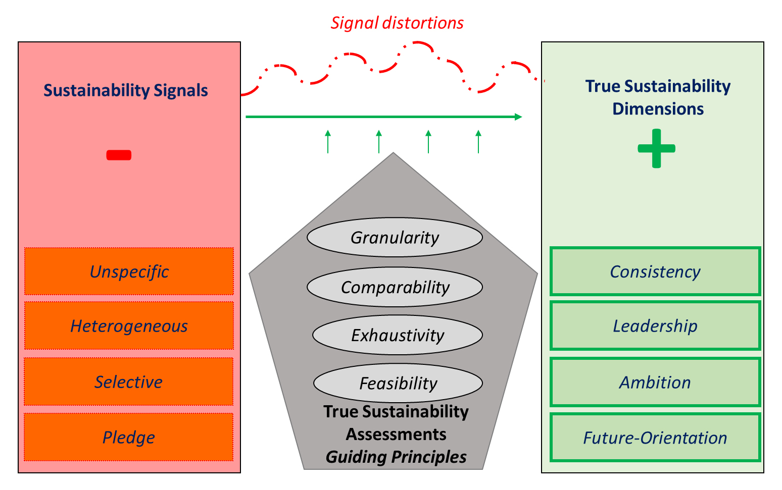 Figure 1. Signals distortions in true sustainability, guiding principles, and dimensions for a framework to operationalize true sustainability.