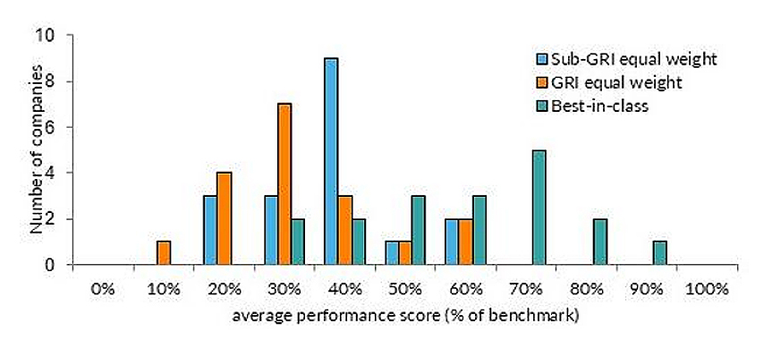 Figure 3. Leadership in true sustainability across industries, companies, and environmental themes. Performance scores as a % of the benchmark.