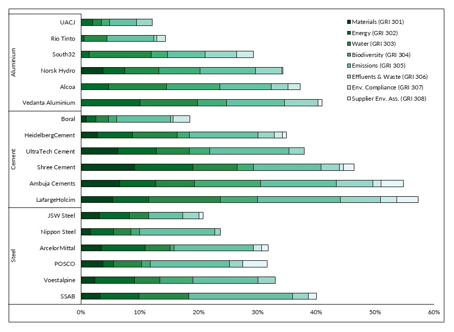 Figure 3 summarizes leadership performance at both company and industry levels across all environmental themes. Cement producers leading the sample, LafargeHolcim, Ambuja, and Shree, present relatively high and balanced scores across all themes, whereas low-scoring companies tend to underperform in categories less directly linked to operational processes, such as biodiversity (GRI 304), effluents & waste (GRI 306), environmental compliance (GRI 307), and supplier environmental assessment (GRI 308).