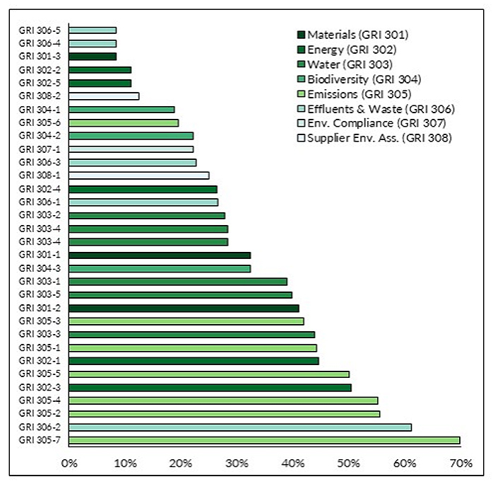Among all sustainability indicators in the GRI guidelines, including Environmental, Social, and Governance (ESG), we focus on the environmental ones. While the role of social and governance dimensions in transitioning to true sustainability are significant, stakeholders scrutinize the environmental signals of highly-polluting companies more intensively [14]. According to the GRI 2016 reporting guidelines applied in the 2019 sustainability reports (GSSB, 2016), eight environmental GRI indicators (GRI 301 to 308) cover the following environmental themes: materials (GRI 301), energy (GRI 302), water (GRI 303), biodiversity (GRI 304), emissions (GRI 305), effluents and waste (GRI 306), environmental compliance (GRI 307), and environmental supplier assessment (GRI 308). These are further split into 32 sub-GRI or sub-environmental themes.