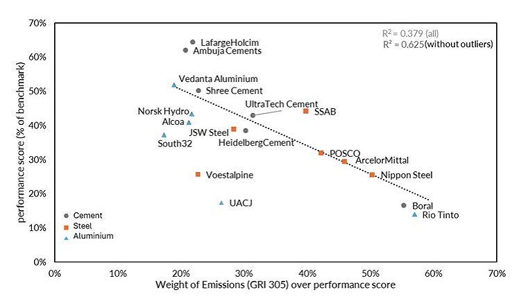 Figure 5. The weight of emissions (GRI 305) in the performance score. Trendline adjusted by outliers.