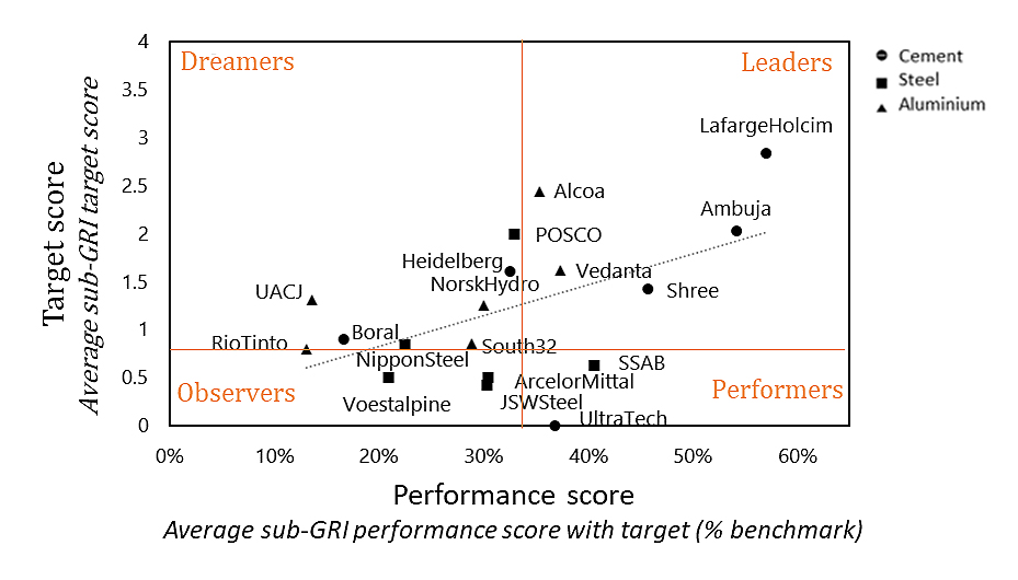 Figure 7 presents the empirical application of the true sustainability framework across the companies and industries analyzed. The results reveal the discrepancy between performance and target scores (R2 = 0.2735), suggesting that environmental targets are not fully supported by prior performance data, and that high environmental performance does not necessarily translate into ambitious target setting except among leaders. The Leaders quadrant is empirically defined by companies such as LafargeHolcim and Ambuja, which pair strong performance with the most ambitious targets. In contrast, SSAB and Ultratech are prominent within the Performers group, exhibiting significant environmental performance but lacking ambitious targets. These discrepancies suggest that better performance scores demonstrating consistency, leadership, and ambition are not always matched by future-oriented target setting, potentially undermining the company’s commitment to true sustainability. We find a significant amounts of companies in the Dreamers cluster (e.g., UACJ, Heidelberg), where ambitious targets contrast with weak past performance, suggesting that target feasibility is compromised by weak prior environmental performance, which may fail to signal true sustainability advancements. Finally, the Observers group, with Voestalpine and Nippon, shows weak performance and minimal target setting, reflecting limited true sustainability engagement.