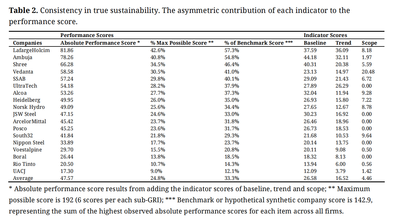 Our hypothetical synthetic company, or benchmark, is constructed by combining the highest observed score for each item across all firms in the sample. This synthetic profile therefore represents the best-achieved performance observed in the dataset—a reference point for both intra- and inter-industry comparisons. The benchmark achieves a total score of 142.9, which corresponds to 74.4% of the maximum possible score. Table 2 illustrates the gap between firm performance scores and the benchmark. Higher performance scores reveal greater leadership in true sustainability. Cement producers LafargeHolcim, Ambuja, and Shree lead the performance ranking (see Table 2). However, when compared to the benchmark, their scores represent only 57.3%, 54.8% and 46.4%, respectively. This indicates that even the best performers remain distant from the true sustainability benchmark case.
