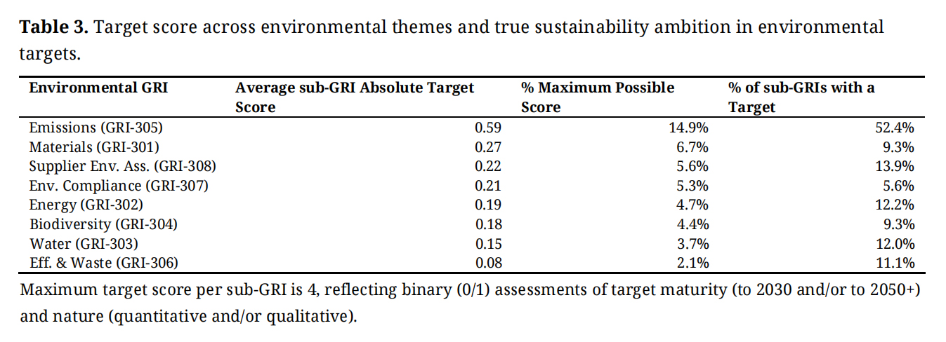 Table 3. Target score across environmental themes and true sustainability ambition in environmental targets.