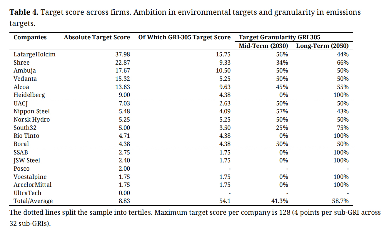 Table 4. Target score across firms. Ambition in environmental targets and granularity in emissions targets.