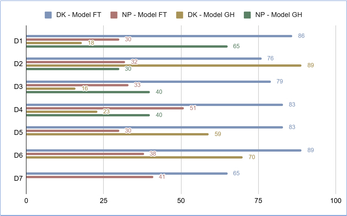 Apart from these metrics (UAI and AI) the results revealed a high cultural distinctiveness between DK and NP. For that purpose, one crossed the results between countries, together with the comparable dimensions between models (7D: FT: D1~D7; and, 6D: GH: D1~D6) testing them by using the initials of the main authors (“FT” and “GH”) for simplification of the visuals (vide Figure 1).