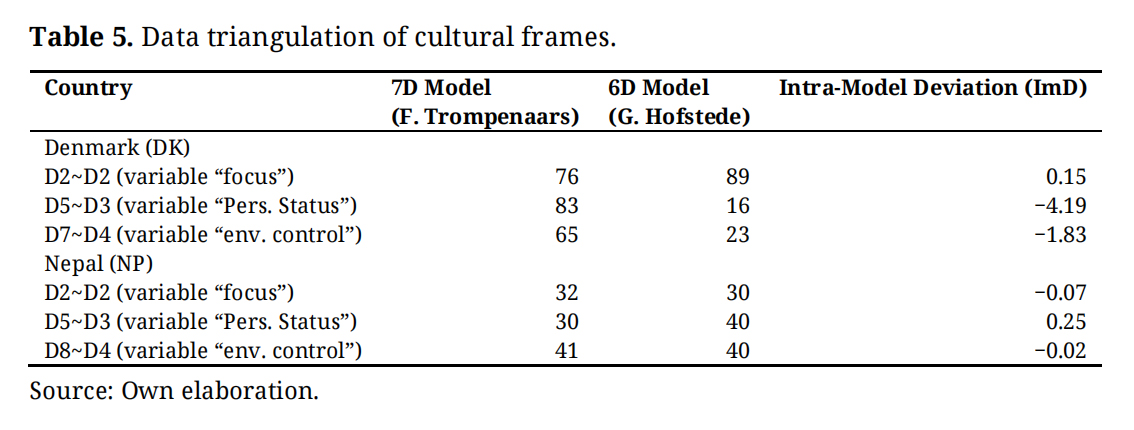 Hence, cross-analyzing these model-specific benchmarks, one triangulated the intra-model cultural frames’ scores. In the table above, it is shown firstly a triangulation of 3 dimensions of the 7D model which are directly comparable with 3 other dimensions of the 6D model, as they are centered on equivalent variables of analyzability: focus (Foc); personal status (PSt); and environment-control (EnC). The results of such intra-model deviation (ImD) denote, markedly, a higher degree of consistency in NP figures than in DK ones. Besides, the variations found in DK to PSt (D5~D3) and EnC (D7~D4) unveil seminal differences of parametrization swiftly explored in this paragraph. The variable PSt at the 7D model classifies Danes as “achievers” while the 6D as “consensus” seekers ([80], Cultural Factor, online), holding their results diametrically different results. The explanation for such discrepancy in data resides on the parametrization of the 7D as to the focus on specific tasks, information and work (“what to do”), versus a 6D model with parametrization centered on societal structure and dynamics and quality of life which achievement represents, equality (societal structure), solidarity (in social dynamics) and quality of life the notion of “work-life balance”. Hence, it is also arguable that the perception of consensus in 6D is consistent with the perception of achievement in the 7D model, as the perception of a successful realization (achievement) of a structure of society and quality of life.