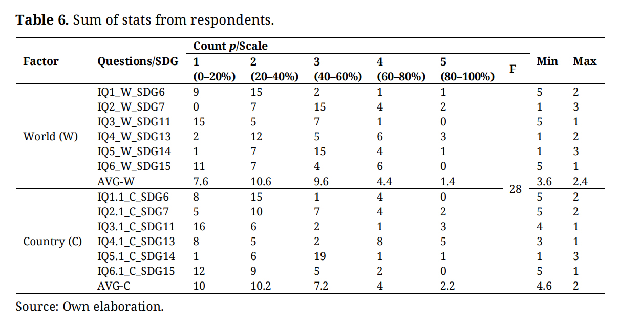 Survey DataPrimary data obtained from the application of a closed-end questionnaire was designed, to exam the sample group, containing 12 questions covering the six (6) dimensions of the E-pillars of the SDGs: SDG6 (clean water), SDG7 (clean energy); SDG11 (green urban living); SDG13 (environment protection activism); SDG14 (marine life); and SDG15 (life in land). Each of the SDGs had a question about the sample’s own country and about their perception of the western world on these SGDs (including herein, DK). The correspondence of investigative questions (IQ) and the SDGs and the respective results is presented in the Table 6 below: