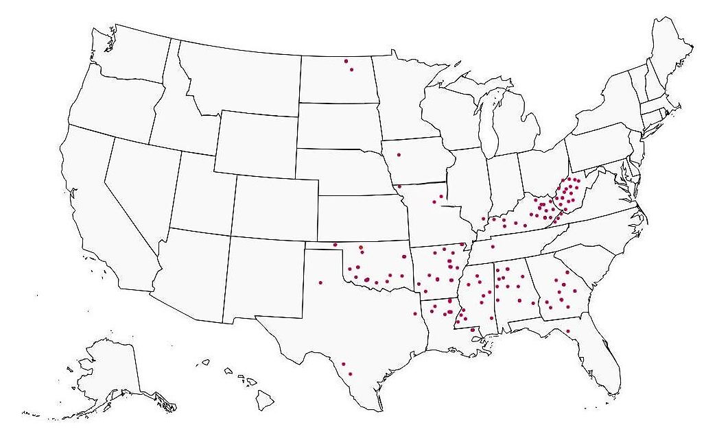Figure 1. Location of 100 percent rural U.S. counties with the lowest cost-of-living, 2024.