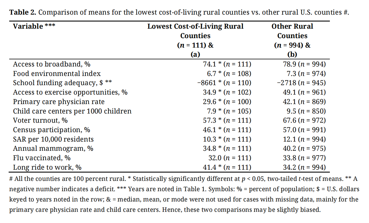 Table 2. Comparison of means for the lowest cost-of-living rural counties vs. other rural U.S. counties #.