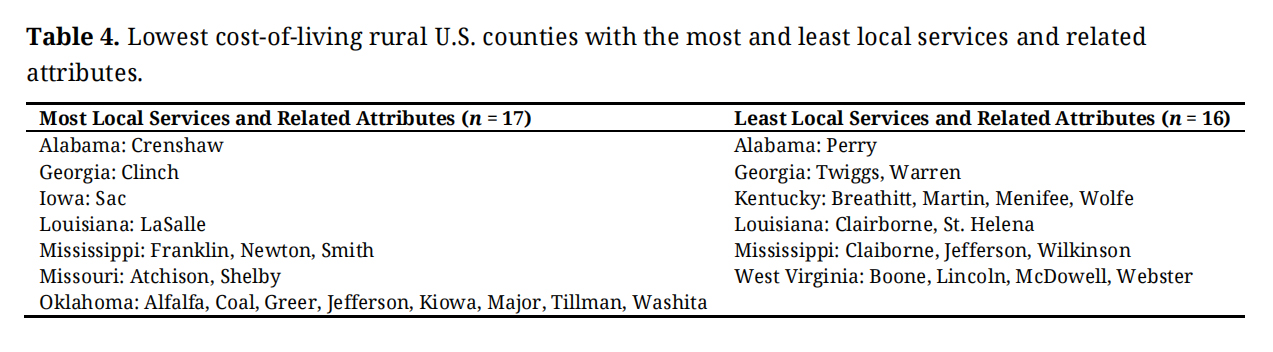 Table 4. Lowest cost-of-living rural U.S. counties with the most and least local services and related attributes.