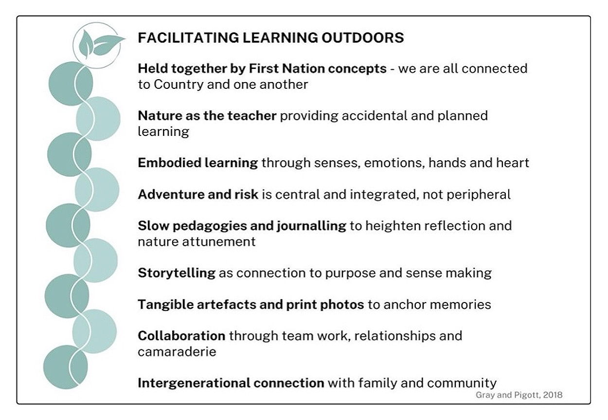 The GoP is heading into a second year of operation and can utilise these findings to enhance the program’s impact and acceptableness by amplifying and adjusting aspects of operation and delivery. Findings may be transferable to similar sustainability and environmental education interventions involving disadvantaged youth. Recommendations have been organised against design principles (see Figure 2) for facilitating outdoor learning that emerged from thirty years of reflective practice in the industry [10]. The following six provisional design principles are offered as analytically derived insights rather than prescriptive guidance, and are intended to inform future research and program design in comparable contexts.