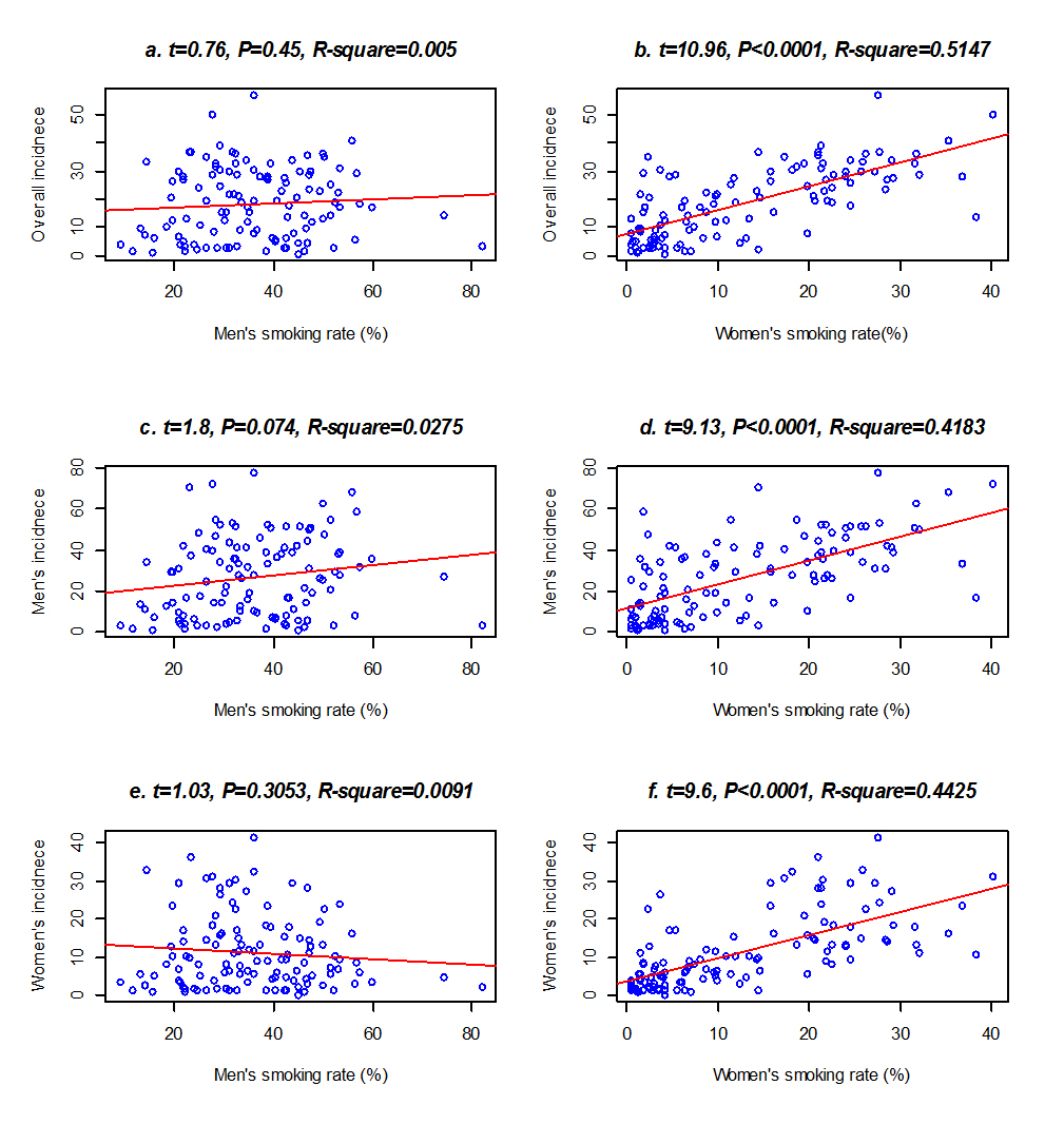 Gender-specific analyses indicated that men's smoking was marginally associated (t = 1.8; P = 0.074) with the incidence of lung cancer in men and explained 2.75% (R2 = 0.0275) of variation (Figure 1c); whereas women's smoking was significantly associated (t = 9.13; P < 0.0001) with the incidence of lung cancer in women and explained 41.83% (R2 = 0.4183) of variation in the incidence (Figure 1d). The cross-analysis showed that men's smoking prevalence was not associated with the incidence of lung cancer in women (Figure 1e), but the women's smoking prevalence was significantly associated (t = 9.6; P < 0.0001) with the incidence of lung cancer in women and explained 44.25% (R2 = 0.4425) of the variation in the risk in women (Figure 1f).